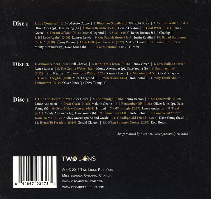 Various Artists - Oscar, with Love (Disc 1) 01. Makoto Ozone - The Contessa (6:17) 02. Robi Botos - Blues for Smedley (3:39) 03. Dave Young/Oliver Jones - Céline's Waltz (5:43) 04. Gerald Clayton - Bossa Beguine (5:11) 05. Benny Green - Cool Walk (3:31) 06. Michel Legrand - Dream of Me (8:17) 07. Bill Charlap/Renee Rosnes - Sushi (4:35) 08. Ramsey Lewis - If I Love Again (3:00) 09. Justin Kauflin - On Danish Shore (3:49) 10. Kenny Barron - Ballad for Benny Carter (8:52) 11. Makoto Ozone - A Little Jazz Exercise (2:28) 12. Dave Young/Monty Alexander - Tranquille (5:56) 13. Hiromi - Take Me Home (4:59) Oscar, With Love: The Songs of Oscar Peterson (Disc 2) 01. Bill Charlap - Announcement (3:41) 02. Benny Green - If You Only Knew (5:15) 03. Renee Rosnes - Love Ballade (6:40) 04. Monty Alexander - The Gentle Waltz (5:24) 05. Justin Kauflin - Summertime (6:13) 06. Ramsey Lewis - Laurentide Waltz (6:22) 07. Gerald Clayton - Morning (4:58) 08. Michel Legrand - Harcourt Nights (8:00) 09. Robi Botos - Wheatland (4:20) 10. Oliver Jones - Why Think About Tomorrow? (5:13) Oscar, With Love: The Songs of Oscar Peterson (Disc 3) 01. Chick Corea - One for Oscar (6:30) 02. Kenny Barron - The Smudge (5:06) 03. Lance Anderson - Sir Lancewell (4:59) 04. 小曽根真 - Dear Oscar (4:14) 05. Oliver Jones - I Remember OP (6:03) 06. Hiromi - Oscar's New Camera (4:01) 07. Lance Anderson - OP's Boogie (2:40) 08. Monty Alexander - Trust (4:27) 09. Robi Botos - Emmanuel (4:03) 10. Audrey Morris - Look What You've Done to Me (3:11) 11. Dave Young - Goodbye Old Friend (3:17) 12. Gerald Clayton - Hymn to Freedom (5:20) 13. Robi Botos - When Summer Comes (2:29)