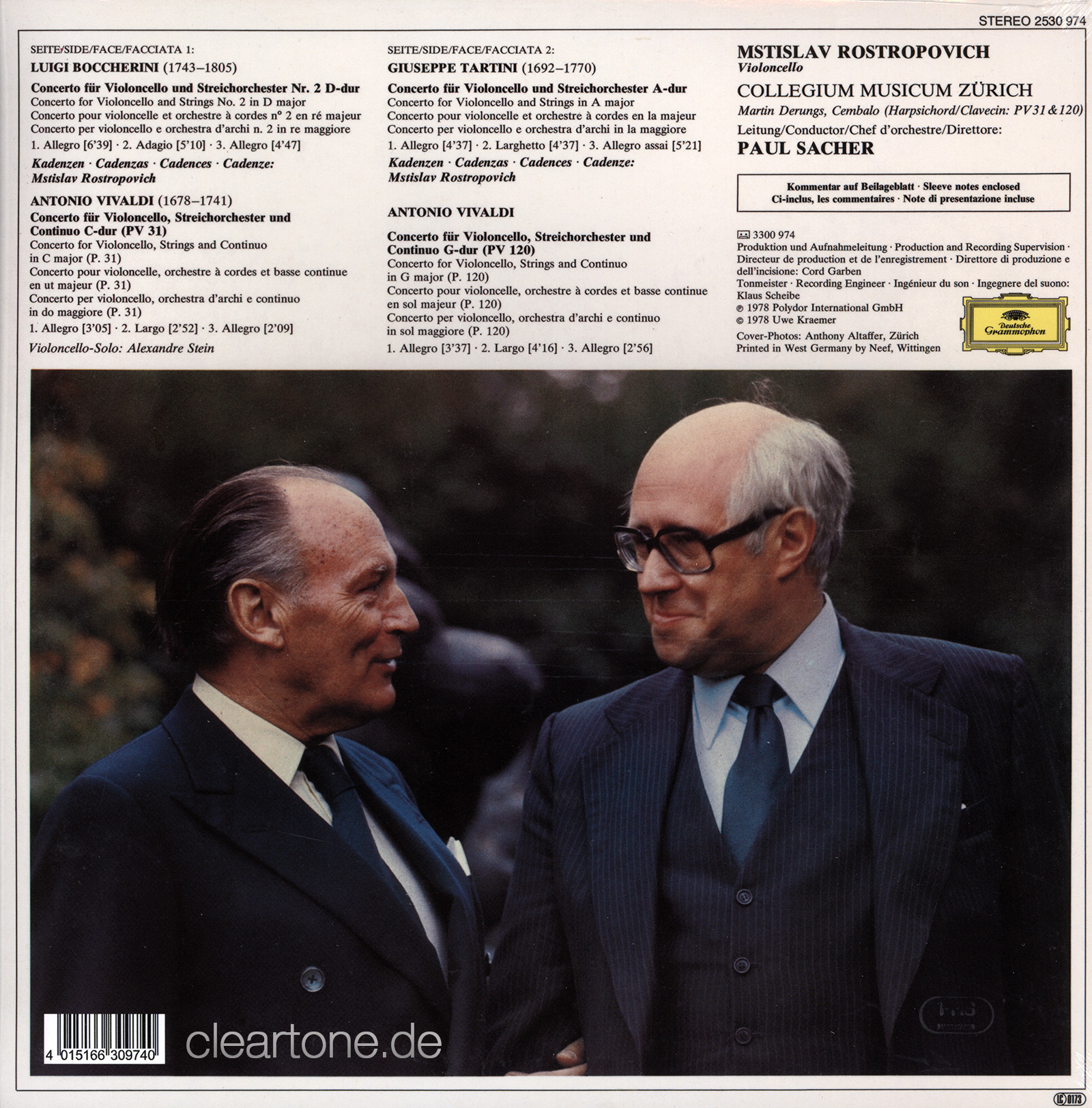 Audiophile Pressing: BOCCHERINI VIVALDI TARTINI Cello Concertos Mstislav Rostropovich – well, who could argue with a statement like that? After all, Mstislav Rostropovich is a supreme virtuoso, a charismatic performer, and a sublime interpreter and virtually every one of his recordings is as good as it gets for the repertoire. The key word, of course, is virtually: while Rostropovich’s Dvorák concerto with Karajan, his Beethoven sonatas with Richter, his Brahms sonatas with Serkin, and above all his Shostakovich sonata with Shostakovich are definitive, can one say the same of his Boccherini, Vivaldi, and Tartini concertos with Paul Sacher?