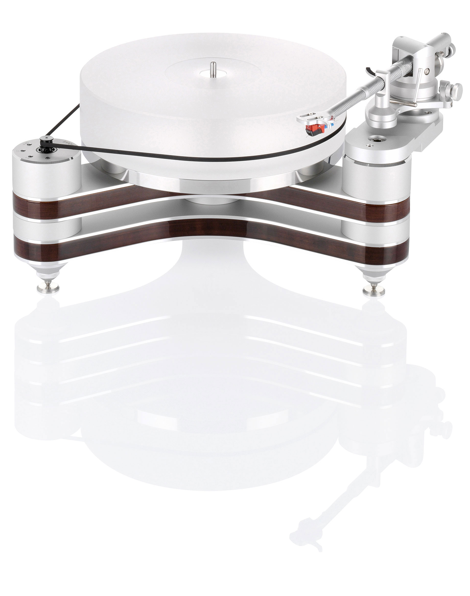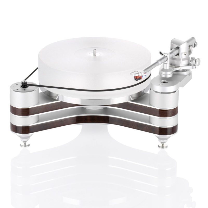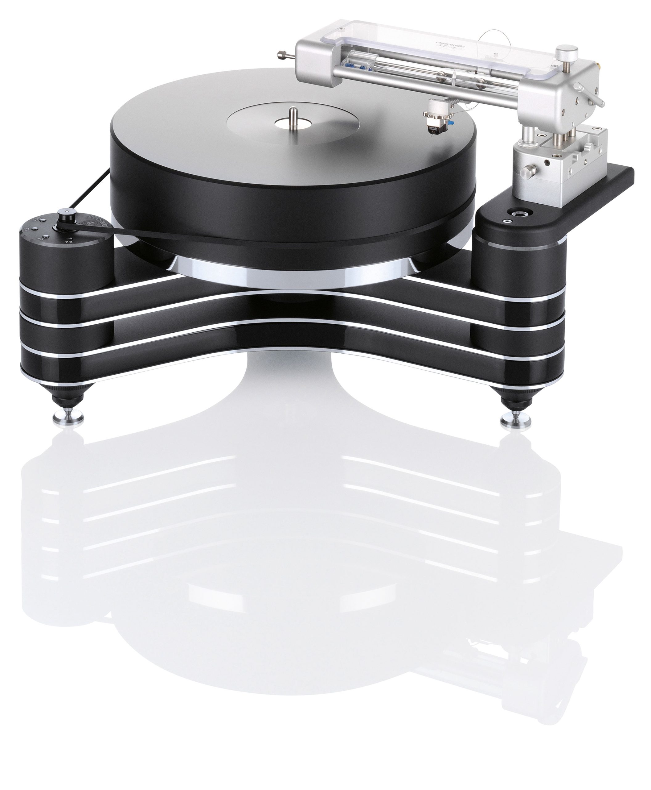 Der gesamt 85 Millimeter starke Plattenteller aus hochverdichtetem 70mm Kunststoff und einem 15 Millimeter starken Edelstahl-Schwungteller ruht auf einem CMB-Keramik-Magnetlager. Die Wahl der Umdrehungsgeschwindigkeit erfolgt ganz bequem auf Knopfdruck. Man kann einen zweiten Tonarm zu installieren.