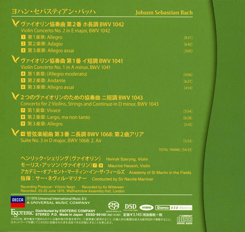 {{soundFile=http://www.ccd.pl/sample/ESSD90140/01.mp3,http://www.ccd.pl/sample/ESSD90140/02.mp3,http://www.ccd.pl/sample/ESSD90140/03.mp3&titles=01. Violin Concerto in E BWV 1042: I. Allegro (8:24),02. Violin Concerto in E BWV 1042: II. Adagio (6:44),03. Violin Concerto in E BWV 1042: III. Allegro assai (3:13)}}